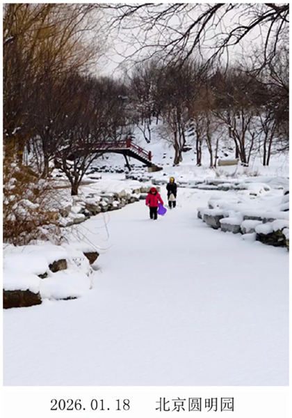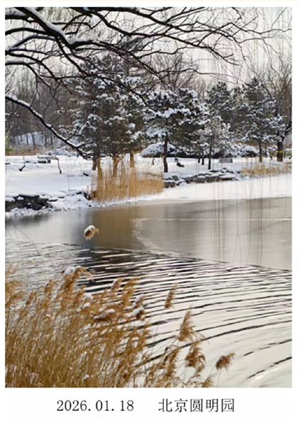 摄影人的勤勉是可嘉的,一年四季如蜂采蜜,不停捕捉四季流转间大自然的斑斓之美。每年冬天我都盼着下雪,每次雪一下来,第二天准到郊区拍摄雪景。大多数人喜欢雪天里的皇家园林和宫殿,那些地方雪后总是人山人海,挤满了拍摄的人们,那样的热闹我不喜欢。去年12月初我已过了八十大寿,今年一月十七日下午和晚上北京迎来了2026年的第一场雪。十八日我起来后,吃完早餐立即出发去圆明园西半部拍摄雪景。还有一年,北京在十一月初下起了大雪,第二天我起个大早来到国家植物园,那时秋天未尽的余韵色彩丰富和冬日的白雪在一起自然相融,宛如一幅浑然天成的水墨中国画,美极了!